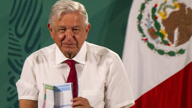 El presidente mexicano, Andrés Manuel López Obrador, muestra su certificado de vacunación completa.(Getty Images)
