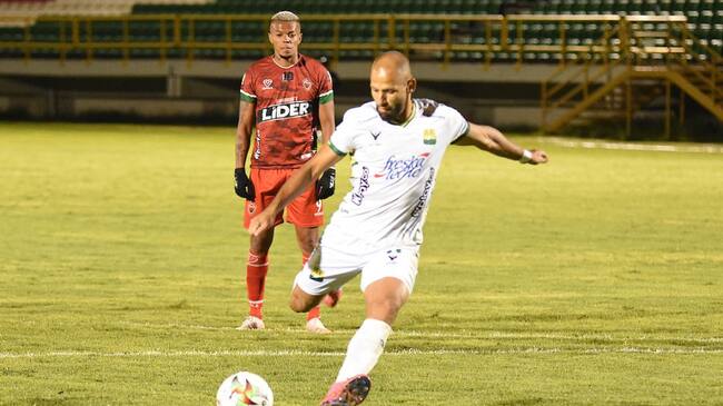 Brayan Fernández, futbolista de Atlético Bucaramanga en el lanzamiento de penal que abrió el marcador ante Patriotas / Dimayor