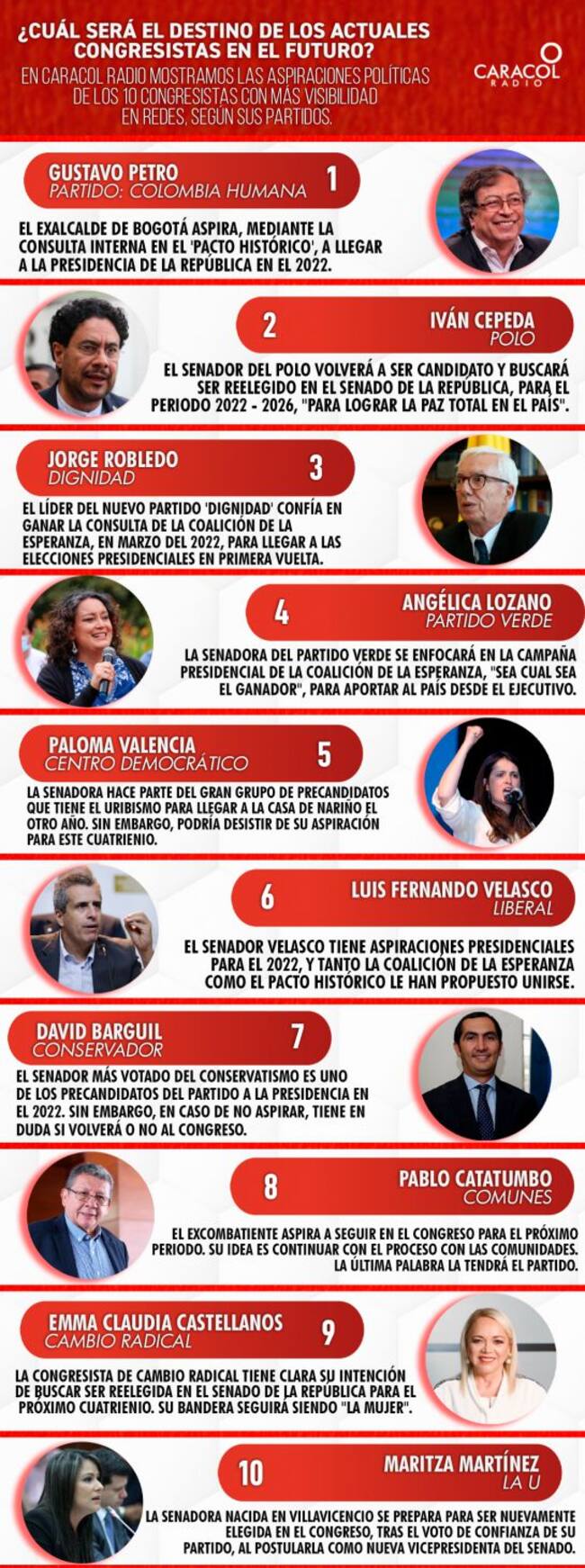 En Caracol Radio mostramos las aspiraciones de los 10 congresistas, con más visibilidad en redes según sus partidos.