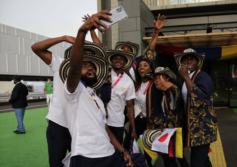Los deportistas colombianos posan alegres antes de desfilar por el Estadio Olímpico.