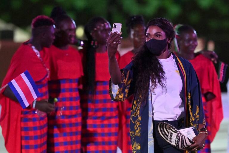 Caterine Ibargüen toma fotografías de la ceremonia de inauguración.