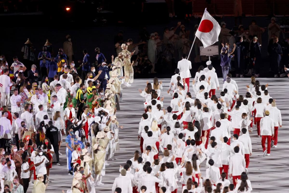 La delegación japonesa y anfitriona desfila en su ceremonia inaugural.