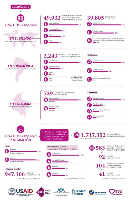Betty Pedraza, directora de Espacios de Mujer, ONG que trabaja en el marco del programa Conectando caminos por los derechos, financiado por USAID, y que acompaña procesos de prevención de la trata de personas, atención a mujeres en contexto y ejercicio de prostitución y migrantes colombianos retornados, “teniendo en cuenta que para 2020 había reportados oficialmente 1.717.352 ciudadanos venezolanos en Colombia, el país se convierte en el mayor receptor de refugiados y migrantes del país vecino en la región y en el mundo”.