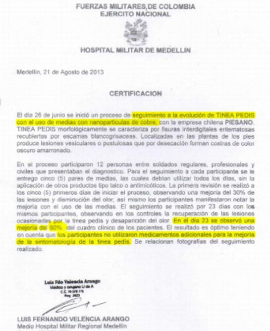 Por su parte, la Dirección de Sanidad de la Policía, contrario a lo que dice Normas Técnicas del Ministerio, ratifica que los calcetines con nanotecnología de cobre son una alternativa útil para disminuir riesgos de mal olor y de presencia de lesiones de hongos.
