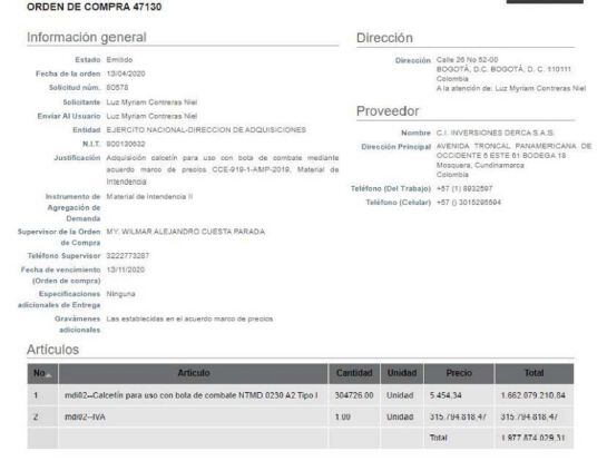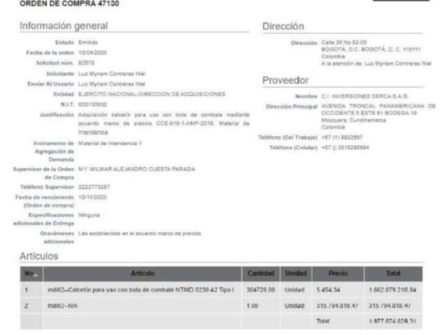 Cuando ya existía ese concepto del Invima, en abril del 2020 la Dirección de Adquisiciones del Ejército compró 304.726 pares de calcetines a la empresa Inversiones Derca S.A.S, por un valor superior a los 1.800 millones de pesos.