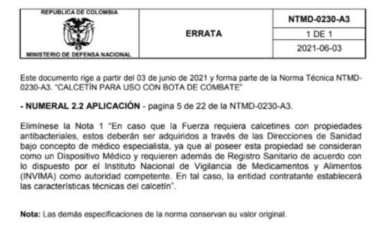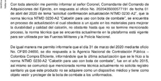 En una carta del 7 de abril de 2020, seis días antes de la compra de los calcetines, el entonces subdirector de Normas Técnicas del Ministerio de Defensa, el coronel (r) Hernando Narváez Fierro, explicaba al jefe del Comando de Adquisiciones del Ejército, coronel Joselin Vargas Zarate, que la norma técnica A2 del calcetín estaba en proceso de actualización, pero que, no obstante, seguía vigente para ser utilizada por las Fuerzas Militares y la Policía Nacional.