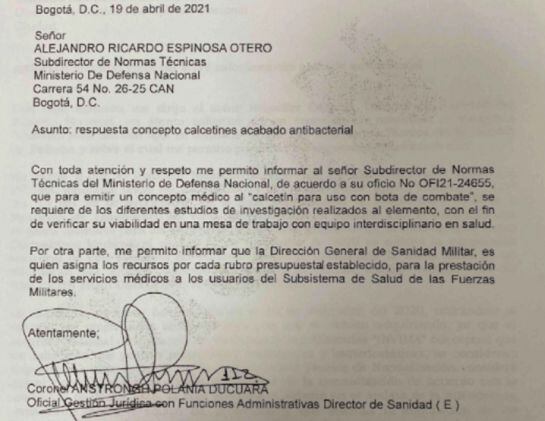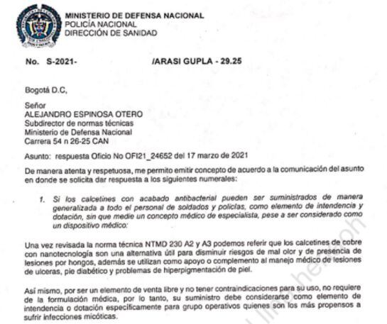 Y menciona: “Así mismo se comunicó que mencionada norma técnica actualmente no solicita registro sanitario ya que este producto no se adquiere como un dispositivo médico y tiene como objeto vestir y proteger de la bota de combate a los uniformados”, dice el funcionario sin tener con un estudio médico que lo soporte y dejando a un lado el concepto del Invima, que decía todo lo contrario.