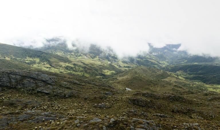 Desde lo más alto de las montañas de Santurbán aparecen los frailejones y la producción agrícola a lo lejos.