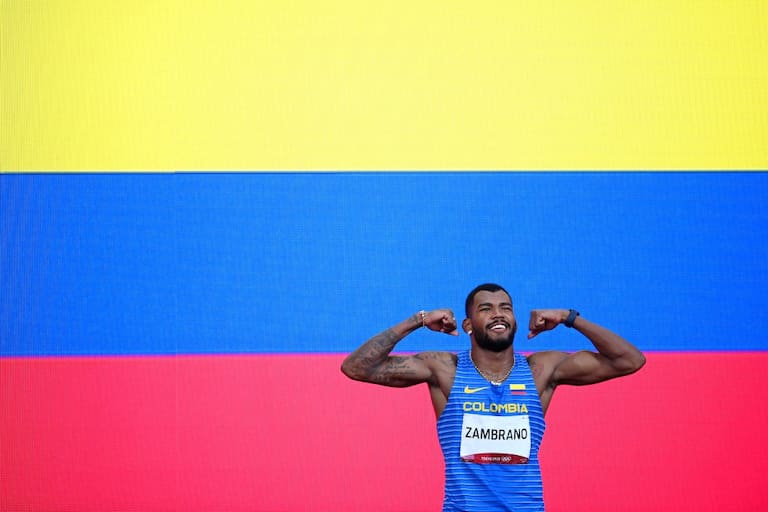 Zambrano posa con la bandera de Colombia de fondo tras ganar la medalla de plata.