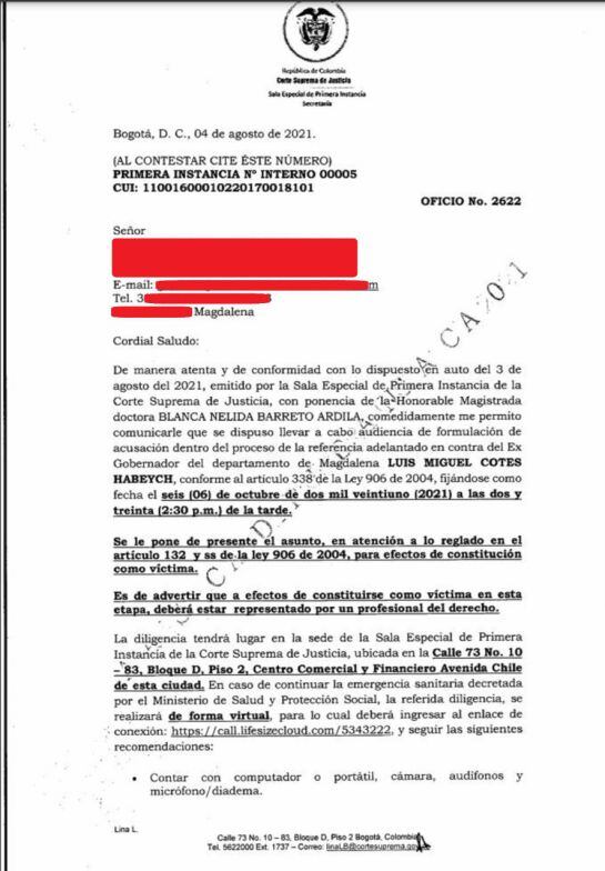 Caracol Radio conoció que la Corte Suprema de Justicia citó para el próximo 6 de octubre al exgobernador del Magdalena Luis Miguel Cotes a audiencia de acusación formal en su contra por presunta corrupción en la licitación del chance que terminó en manos de Enilce López, alias ‘La Gata’ en el año 2012.