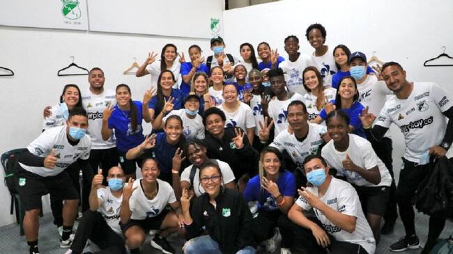 El plantel del Cali festeja el triunfo sobre el Bucaramanga. / @CaliFemenino