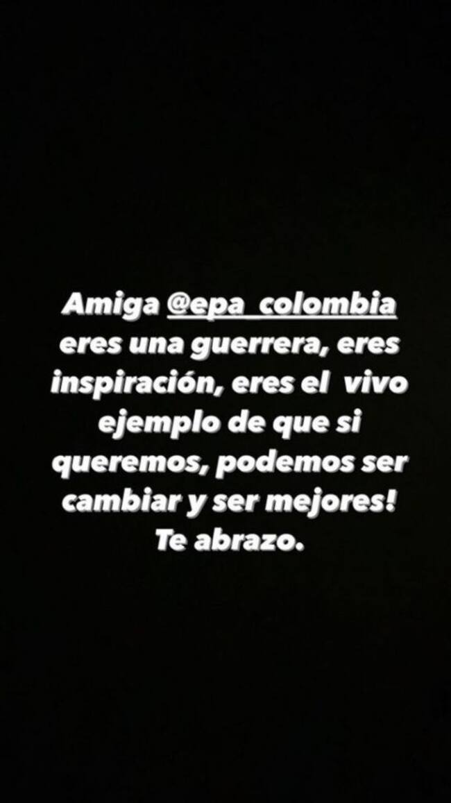 “Amiga, ‘Epa Colombia’, eres una guerrera, eres inspiración, eres el vivo ejemplo de que, si queremos, podemos cambiar y ser mejores. Te abrazo”, escribió la actriz.