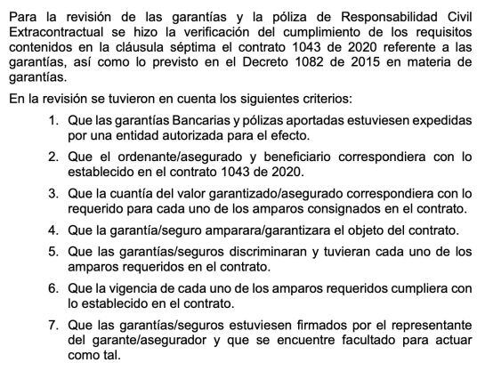 “Dentro del proceso de verificación, no se observaron elementos que hicieran dudar o poner en tela de juicio la autenticidad de las garantías y póliza; los cuales, de haberlos evidenciado, se hubiesen notificado al encargado del contrato”, puntualiza en su justificación la firma encargada de la revisión de los documentos del Contrato de Centros Poblados por más de $1,2 billones de pesos, que tiene en riesgo $70.000 millones que se giraron de anticipo.