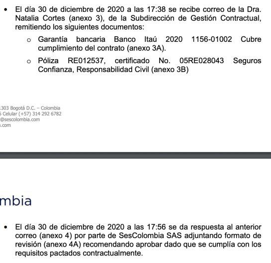 El informe con fecha de junio de este 2021 firmado por Alex Pilonieta Hofheinz, representante legal de SES Colombia, se dirige a Sandra Orjuela Méndez, subdirectora de Gestión Contractual Supervisora contrato 108 de 2021 Ministerio de Tecnologías de la Información y las Comunicaciones y detalla además como hicieron el proceso de verificación de los documentos.