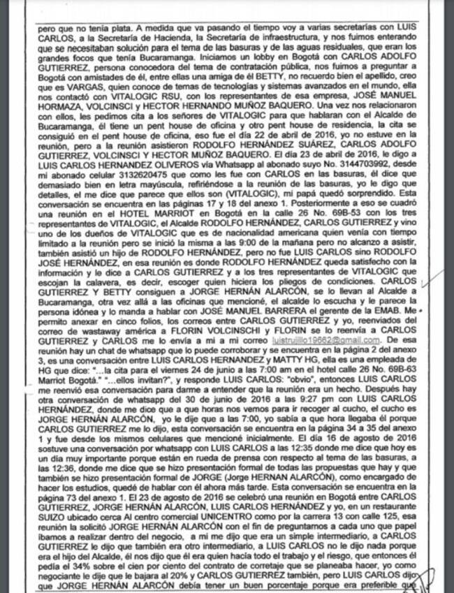 Dijo que en 2016 se cuadró una reunión en el Hotel Marriot de la calle 26 en Bogotá, a la que asistieron los tres representantes de Votalogic. En esa reunión Rodolfo Hernández le dijo los asistentes que escogieran la “Calavera” es decir, quién hiciera los pliegos de condiciones.