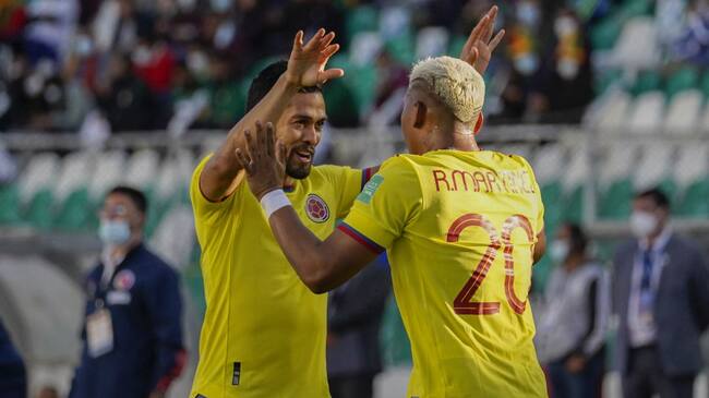 Andrés Andrade festeja junto a Roger Martínez el gol de Colombia. / Getty Images / JAVIER MAMANI