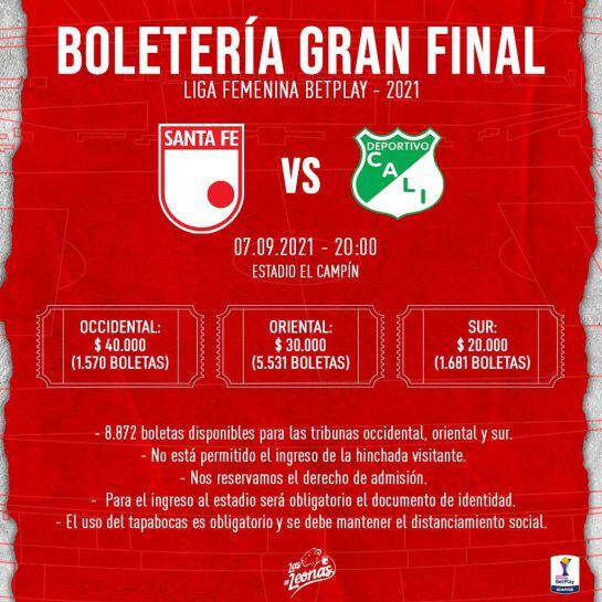 Entre tanto, Independiente Santa Fe confirmó el precio de la boletería para que los hinchas de las 'Leonas' puedan ir a apoyar al equipo esta noche en Bogotá. A su vez, confirmó que la afición visitante no podrá ingresar al encuentro.