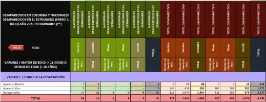 El informe de Medicina Legal indica que, entre enero y julio de 2021, 3.459 personas fueron reportadas como desaparecidas. Sin embargo, de esa cifra se constató que 1.172 aparecieron vivas.