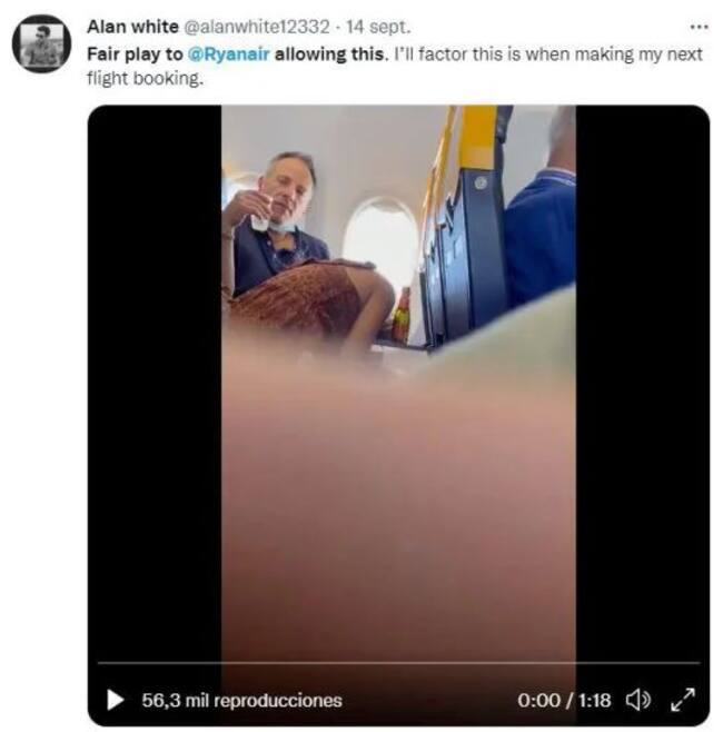 El video fue compartido por el usuario en Twitter llamado Alan White, quién conocería a la pareja. junto al film, el hombre escribió: “Juego limpio con Ryanair por permitir esto. Lo tomaré en cuenta cuando haga mi próxima reserva de vuelo”.