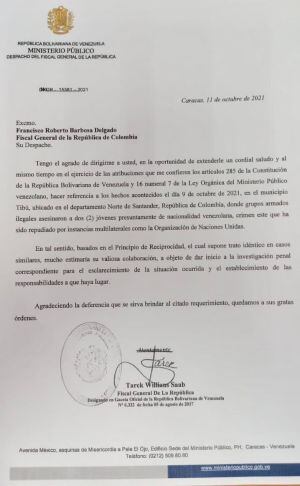 El fiscal general de Venezuela, Tarek William Saab, envió una comunicación oficial a Colombia para solicitar que sea investigados y aclarados los hechos que resultaron en el asesinato de dos jóvenes que podrían ser venezolanos.