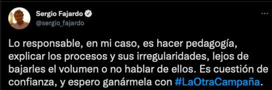 “Lo responsable, en mi caso, es hacer pedagogía, explicar los procesos y sus irregularidades, lejos de bajarles el volumen o no hablar de ellos. Es cuestión de confianza, y espero ganármela con #LaOtraCampaña”, comentó en su cuenta de Twitter.