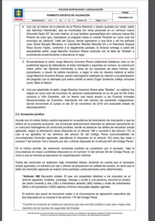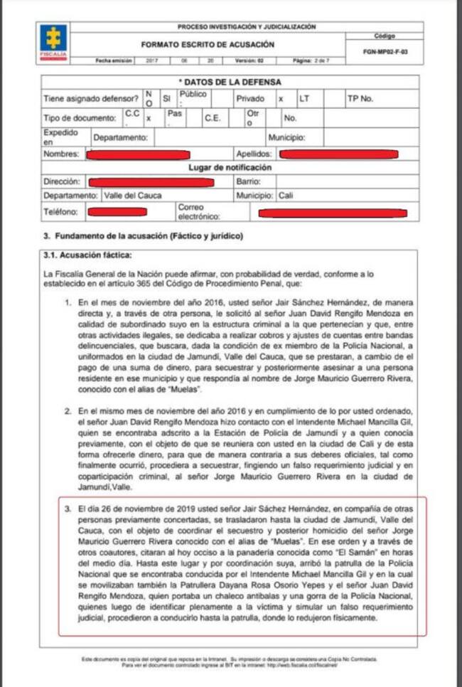 El escrito de acusación conocido por Caracol Radio, señala que a través de su entonces “gatillero” Juan David Rengifo (hoy testigo protegido de la Fiscalía) contrató para esa época de los hechos al intendente Maicol Mancilla Gil, y a la patrullera Dayana Osorio para secuestrar a alias ‘Muelas’ en una panadería de Jamundí, Valle del Cauca.