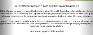 "Se lamenta y rechaza el hecho presentado el 22 de octubre en las instalaciones del parque en la pantalla de la Rueda Chicago, donde se publicó un mensaje que desde ningún punto de vista hace parte con la ideología y compromiso del parque, que solo busca diversión y alegría en sus asistentes", dice parte del comunicado.