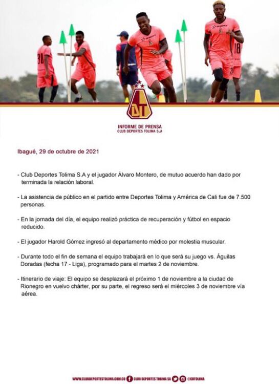 Comunicado sobre la actualidad del club de este viernes. / Deportes Tolima