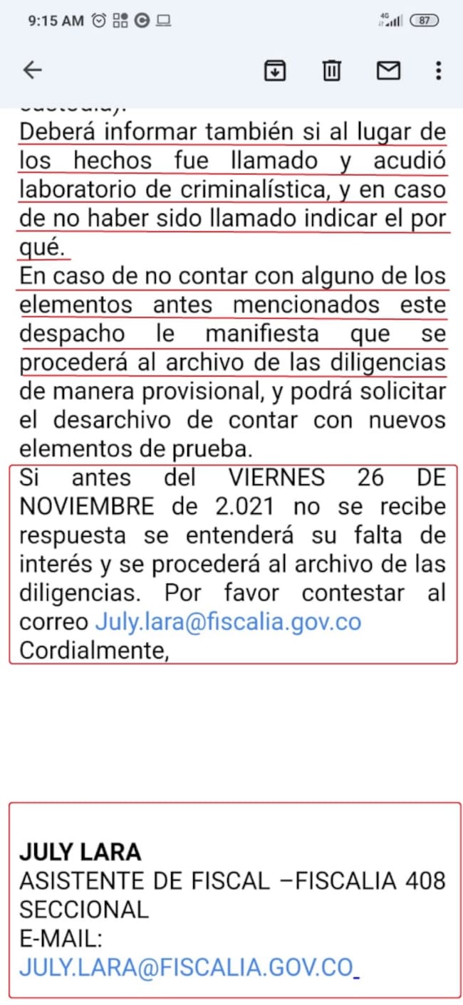 En otro aparte del correo, pide que los videos que posea el denunciante, deben permitir la identificación de las personas involucradas, o que alguno de los involucrados sea reconocido por el denunciante y sepa de quién se trata, para poder hacer la recolección bajo cadena de custodia.