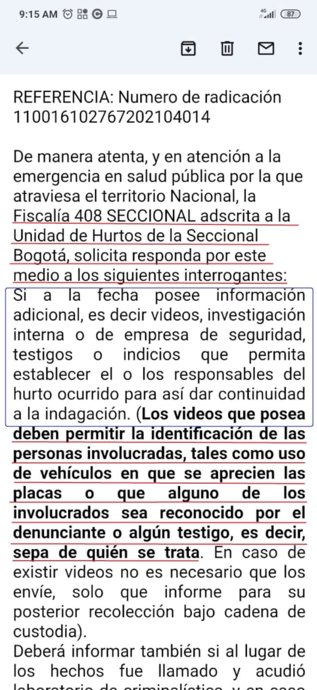 Sin embargo, el despacho de la Fiscalía 408 adscrita a la Unidad de Hurtos de la Seccional Bogotá, envió un correo electrónico a las víctimas, en el que pide información adicional, investigación interna o de empresa de seguridad que permita establecer los responsables del hurto.