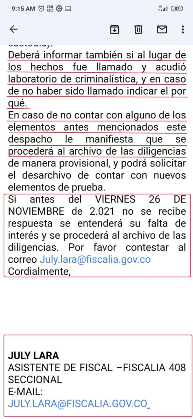 Sin embargo, el despacho de la Fiscalía 408 adscrita a la Unidad de Hurtos de la Seccional Bogotá, envió un correo electrónico a las víctimas, en el que pide información adicional, investigación interna o de empresa de seguridad que permita establecer los responsables del hurto.