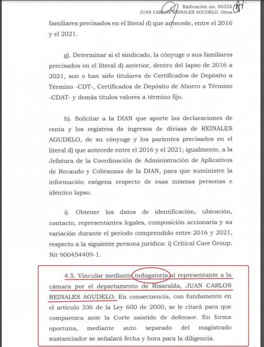 También se ordenó a la Secretaría General del Congreso de la República, las declaraciones de bienes y rentas aportadas por el representante Juan Carlos Reinales Agudelo, tanto en el momento de posesionarse como durante el tiempo en que se ha desempeñado como congresista.