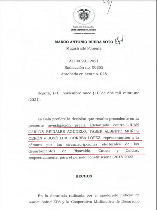 La Sala de Instrucción de la Corte Suprema se abstuvo de abrir investigación en contra de los representantes Faber Alberto Muñoz Cerón, y José Luis Correa López.