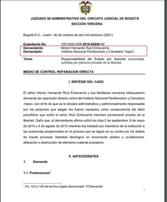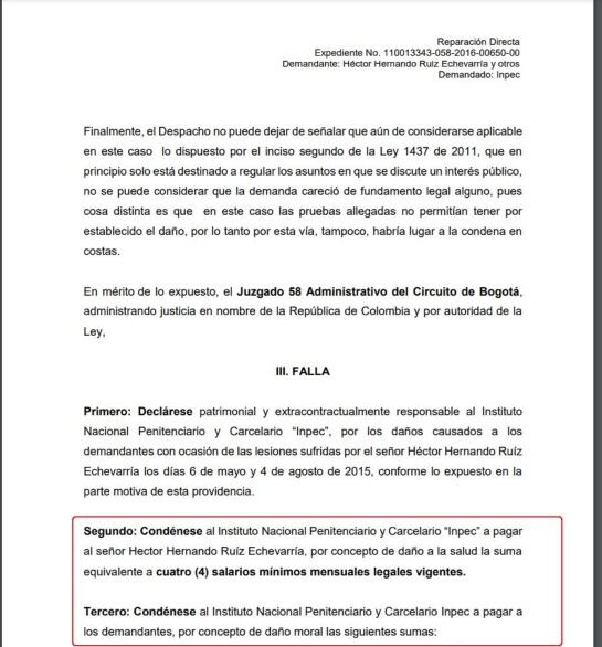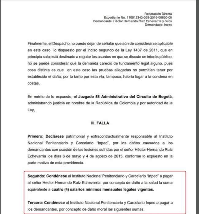 El juzgado 58 administrativo de Bogotá ordenó al INPEC indemnizar con más de $50 millones al abogado Héctor Hernando Ruiz, y a su familia por perjuicios a la salud y daños morales que sufrió en el año 2015, el hoy condenado, por parte de los guardias.