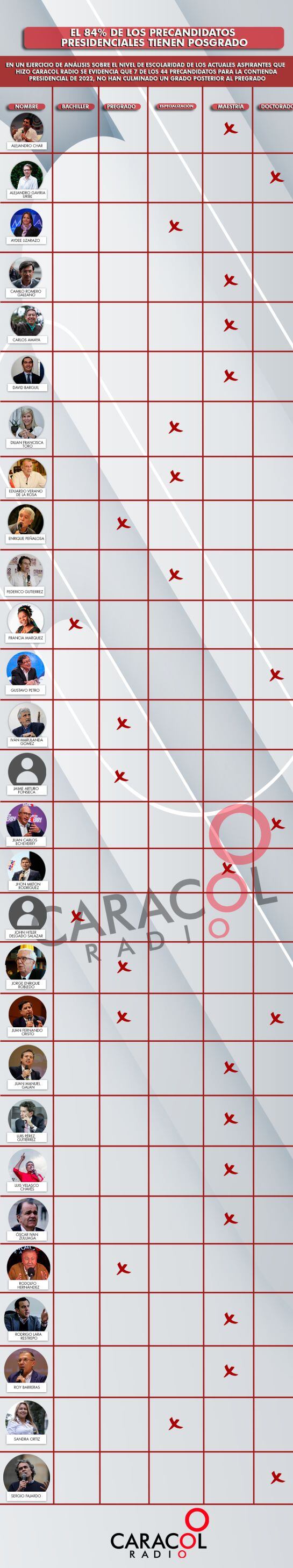 En un ejercicio de análisis sobre el nivel de escolaridad de los actuales aspirantes a la presidencia que hizo Caracol Radio, se evidenció que solo 7 de los 44 precandidatos para la contienda presidencial de 2022 no han culminado un estudio posterior al pregrado. Sin embargo, solo 4 de ellos han culminado un doctorado.