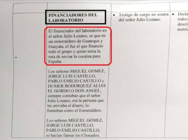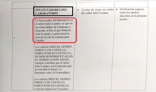 Laureano Martínez y Gustavo Bejarano, quienes fueron los mayordomos de la que era la finca del exembajador Fernando Sanclemente le dijeron a la Fiscalía que Julio Lozano, un esmeraldero de Guateque, Boyacá fue quien financió todo el grupo y quien tenía la ruta para enviar la cocaína a España, según consta en la matriz de colaboración.