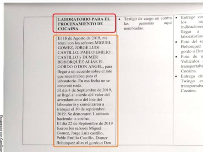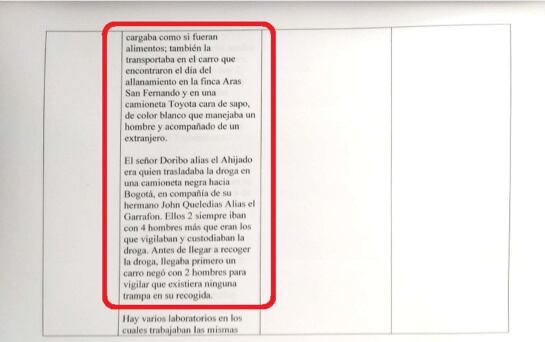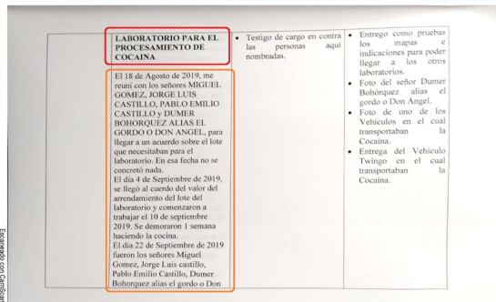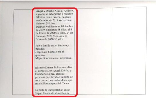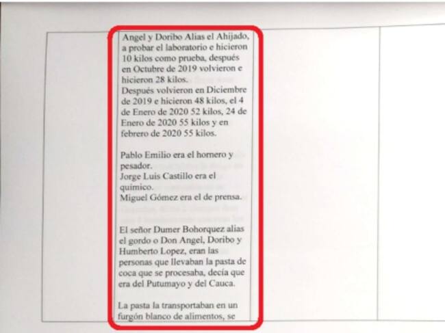“Pablo Emilio era el hornero; Jorge Luis Castillo era Químico; Miguel Gómez era el de prensa; y Dumer Bohorquez era la persona que llevaba la pasta de coca que se procesaba (…) la transportaban en un furgón blanco de alimentos; se cargaba como si fueran alimentos. También la transportaban en el carro que encontraron el día del allanamiento en la finca Aras de San Fernando".