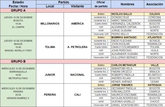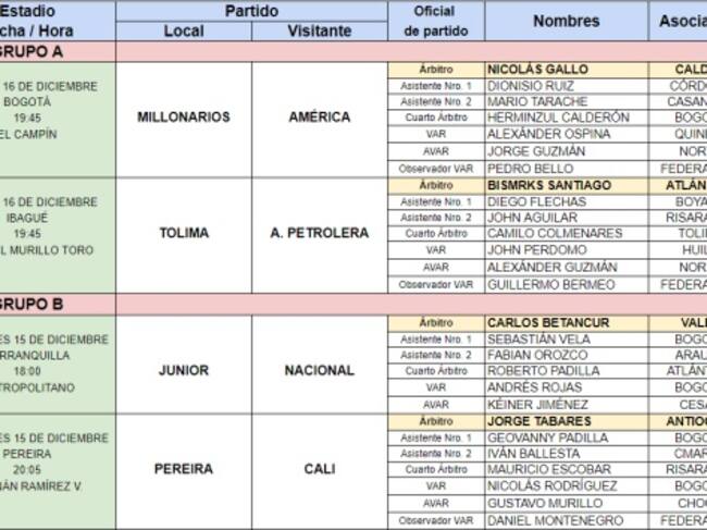 Entretanto, al frente de los juegos del miércoles del Grupo A, que ya solo servirán para la tabla de la reclasificación, estarán Carlos Betancur, en el duelo Nacional-Junior, y Jorge Tabares, en el partido Pereira-Cali.
