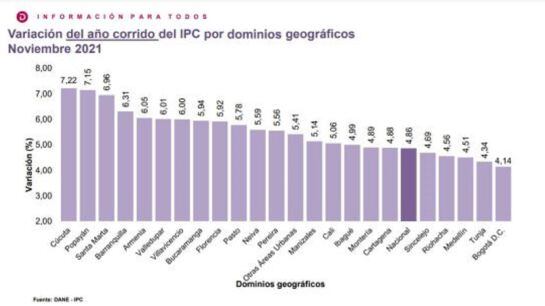 Por su parte, en Colombia y según mediciones del Dane con fecha de noviembre, Cúcuta fue la ciudad donde más variación se presentó con 7,22, por lo que fue la ciudad más costosa para vivir. Bogotá, la más económica con una variación de 4,14, es decir que los bogotanos están comprando una canasta familiar más barata que otras ciudades.