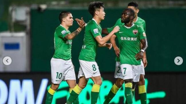 El volante colombiano festeja su primer gol en el fútbol chino. / Instagram: juanferquinterop