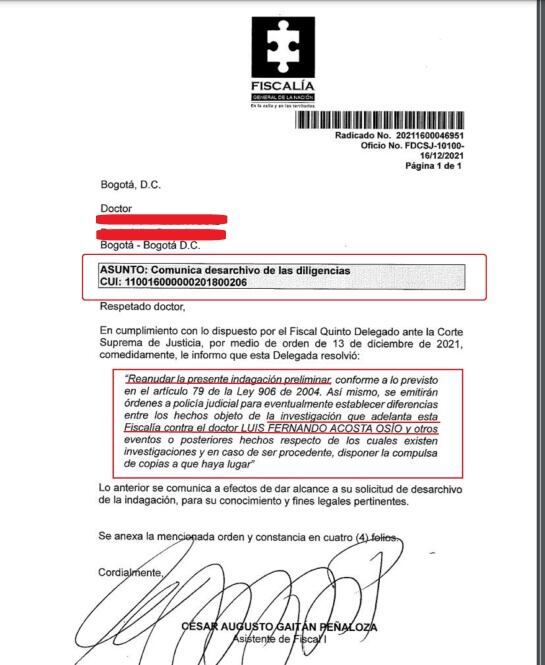 La Fiscalía quinta delegada ante la Corte Suprema de Justicia ordenó el desarchivo de la investigación en contra del ex cónsul Luis Fernando Acosta Osío por los delitos de falsedad ideológica en documento privado, obtención de documento público falso y concierto para delinquir.
