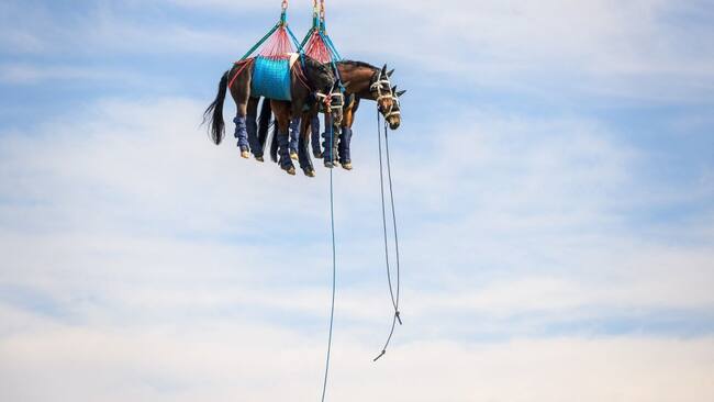 Foto 3 de 10La postal muestra a un caballo transportado por aire durante una prueba de las fuerzas del ejército suizo con un helicóptero. El proyecto científico, llevado a cabo por la facultad de veterinaria de Vetsuisse y el servicio veterinario del ejército suizo, tiene como objetivo transportar y evacuar rápidamente los caballos heridos a una infraestructura médico veterinaria.