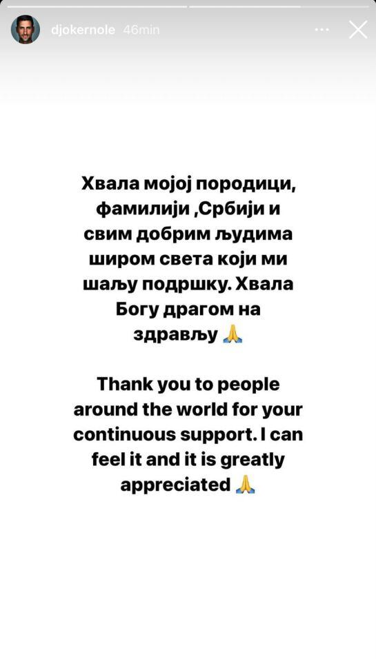 "Gracias a mi familia, a mis amigos, a Serbia, y a toda la gente buena alrededor del mundo que me envía su apoyo. Gracias a Dios por la salud", escribió en un mensaje a través de Instagram.