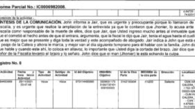 “Jhon informa a Jair que es urgente y preocupante porque lo llamaron de la Fiscalía y que es urgente que realice ampliación de la entrevista, ya que le contaron que Jhonier lo acusa ante la Fiscalía como responsable de la muerte de ellos. Dice Jair que usted ingresó mucho antes al inmueble que cometió el hecho antes de que entrara (…). Jhon dice que el man (Jhonier) le está echando la culpa”.