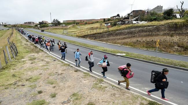 Migrantes venezolanos caminando en vías ecuatorianas luego de cruzar la frontera con Colombia y en camino hacia Perú.(Getty Images)