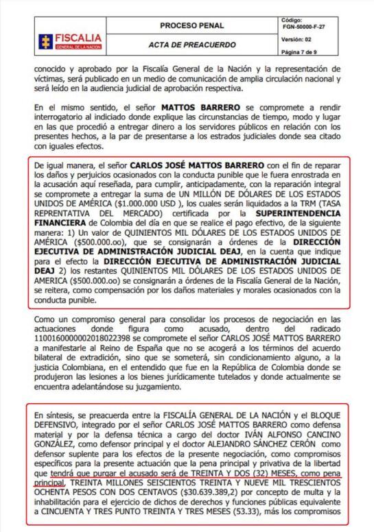 Con el fin de reparar los daños y perjuicios ocasionados por sus conductas criminales en el caso del soborno a la exjueza Ligia del Carmen Hernández, Mattos pagará un millón de dólares; $USD 500.000 que serán consignados a la dirección Ejecutiva de la Administración Judicial, y los otros $USD 500.000 se consignarán a órdenes de la Fiscalía General de la Nación, se reitera, como compensación por los daños materiales y morales.