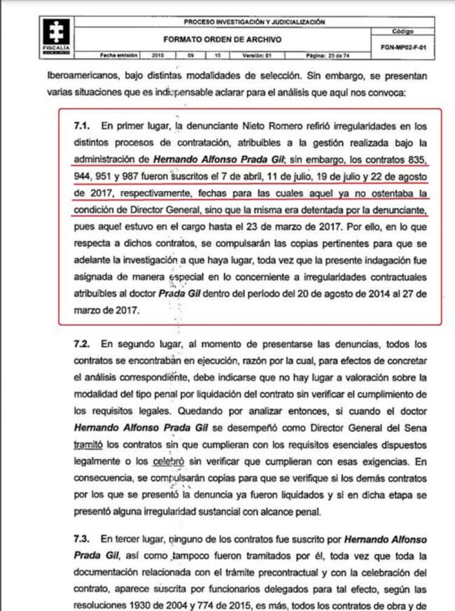 “En primer lugar, la denunciante Nieto Romero refirió irregularidades en los distintos procesos de contratación atribuibles a la gestión realizada bajo la administración de Hernando Alfonso Prada Gil, son embargo, los contratos 385, 944,951, y 987 fueron suscritos el 7 de abril, 11 de julio, 19 de julio y 22 de agosto de 2017 respectivamente, fechas para las cuales aquel ya no ostentaba la condición de director general, sino que la misma era detentada por la denunciante (…) Por ello en lo que respecta a dichos contratos se compulsarán las copias pertinentes para que se adelante la investigación a que haya lugar (…).