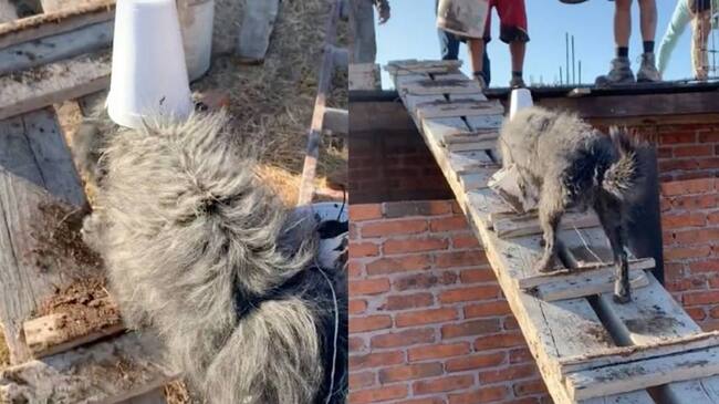 "Sin miedo al éxito": Perro ayuda a albañil en construcción