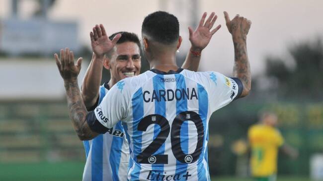 Edwin Cardona festeja su primera anotación con la camiseta de Racing. / @RacingClub