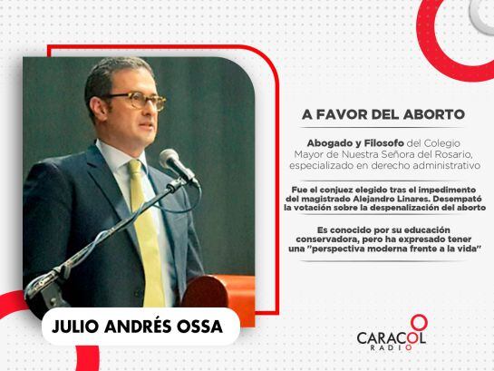 Y por otro lado estaba Julio Andrés Ossa, abogado y especialista en Derecho Administrativo de la Universidad del Rosario, designado para la ponencia de Lizarazo y quien dio su voto decisivo en la despenalización del aborto en Colombia.